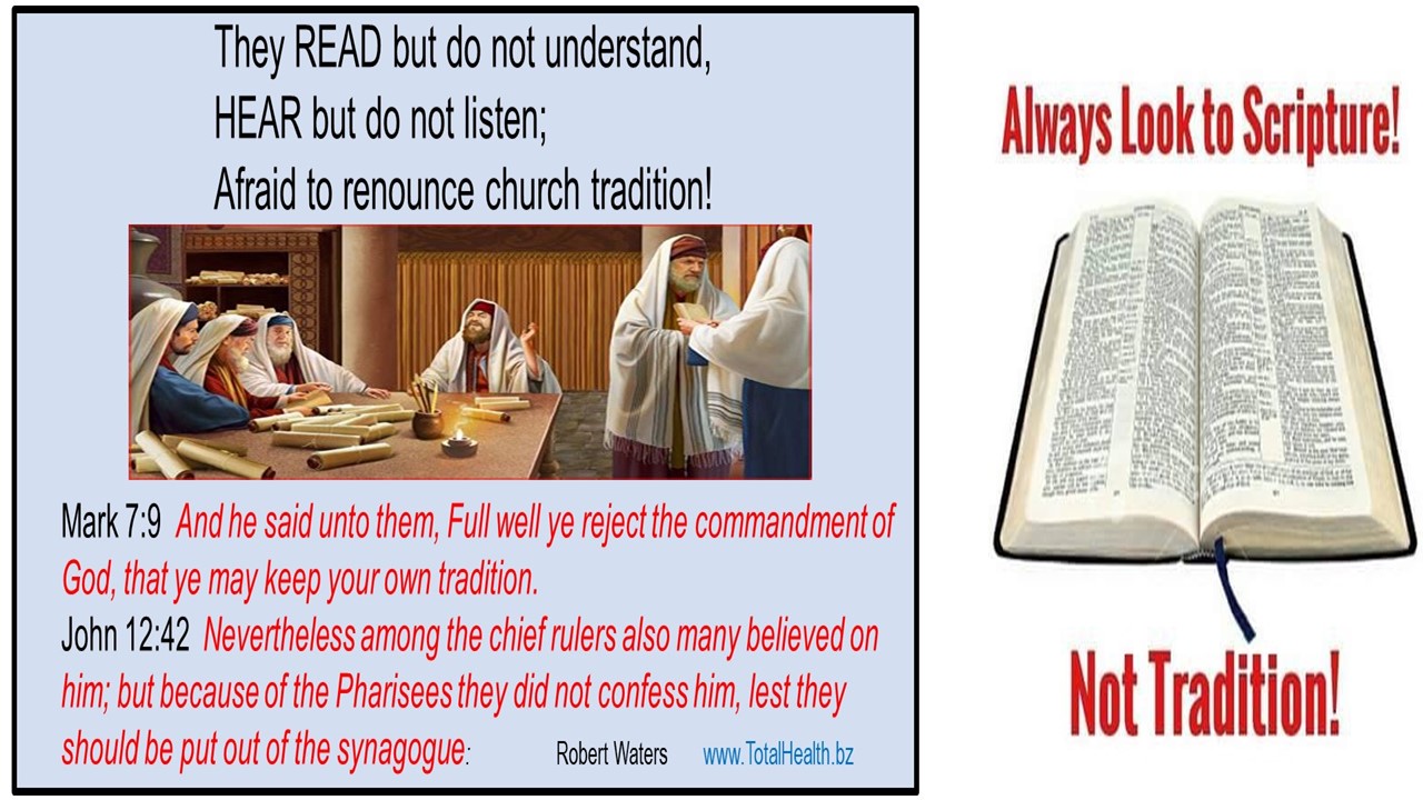 The first chapter addresses the challenge of confronting tradition, which can often be difficult. In the subsequent chapters, I made an effort to thoroughly explore all aspects of the subject, tackling each objection I encountered. However, there is one argument that I find impossible to refute: when someone presents their teachings and beliefs as proof or a standard. But then this is not a valid argument, is it? It simply shows that the person is following the doctrines and commandments of men, which, according to Jesus, renders their religion meaningless. When a person views their tradition as the ultimate standard, they become unable to recognize the truth. This is because they perceive anything that contradicts their beliefs as being in opposition to the word of God. Those who adhere strictly to their traditions see anyone who challenges their teachings as a false teacher, regardless of the validity and reasonableness of their arguments.